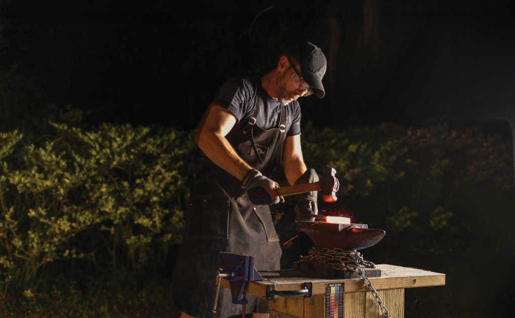 The furnace breathes like a living thing, exhaling air that feels hotter than the surface of the sun. Knifemaker Will Manning extracts the orange-red material with tongs and transfers the glowing metal to an anvil. He pounds and pounds, leaning into each hammer strike. This is just one step in the long, arduous process, as the metal slowly transforms from raw bar stock into something both functional and beautiful.