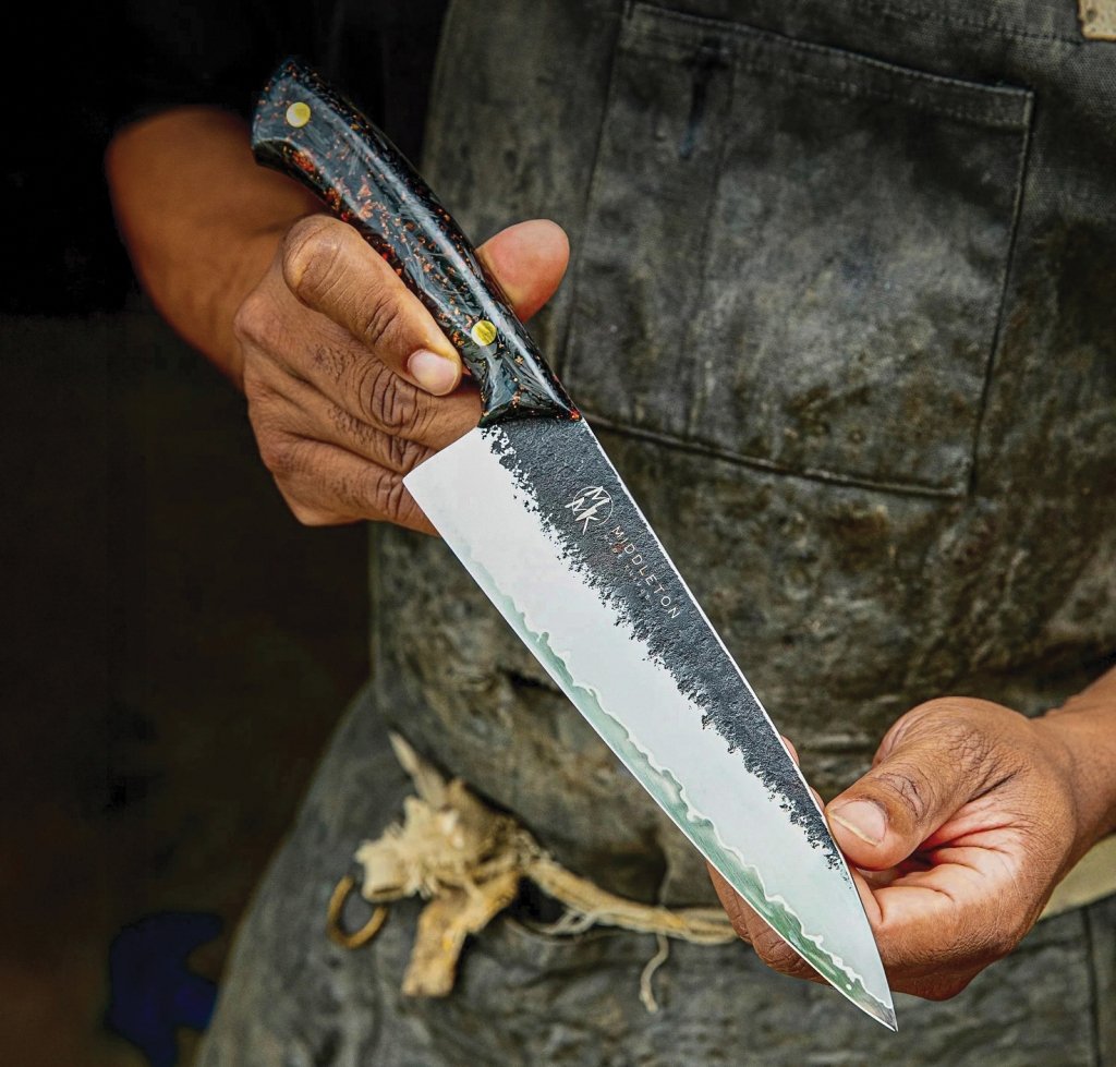 Connecting culture to craftsmanship is a “breath of fresh air” to Quintin Middleton. His roots stem from the Gullah Geechee community, historically centered along the southeastern coast. Initially, Middleton shied away from connecting bladesmithing to his background, but his deeper understanding of the resilience of the Gullah Geechee people soon reflected in his work. “They may take nothing and make something that’s usable, that can inspire. From a chef’s standpoint, they’ll take anything that can be curated into a whole meal made with passion and love.”