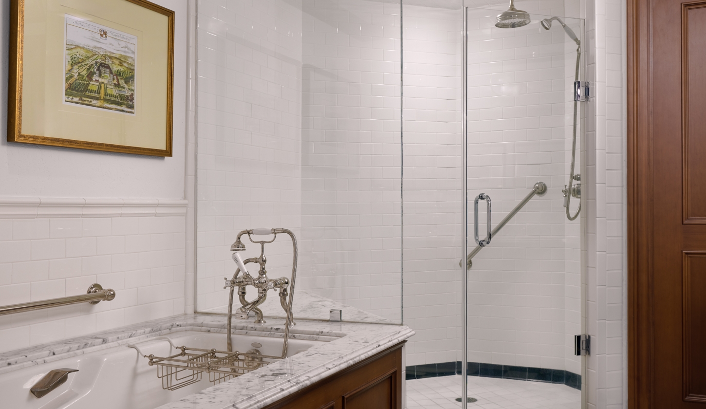 Finely detailed and welcoming room with either one king or two queen beds and marble bathroom.